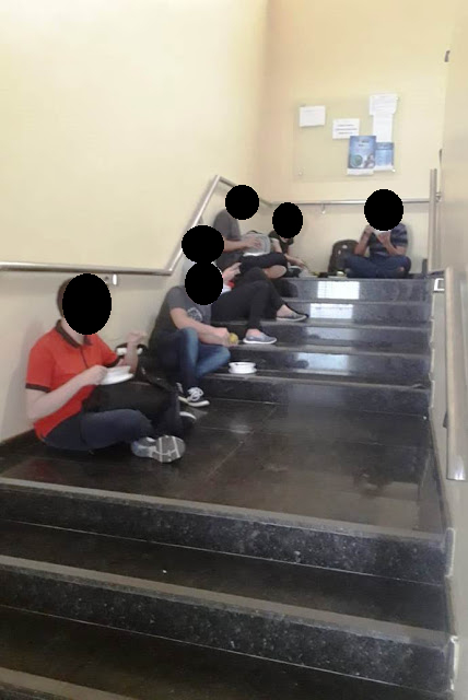 Além da situação vergonhosa de terem de comer pelo chão dos corredores e escadas por falta de estrutura digna, são servidas somente 300 “quentinhas” para um universo de 622 alunos que frequentam quase que diuturnamente o hospital!