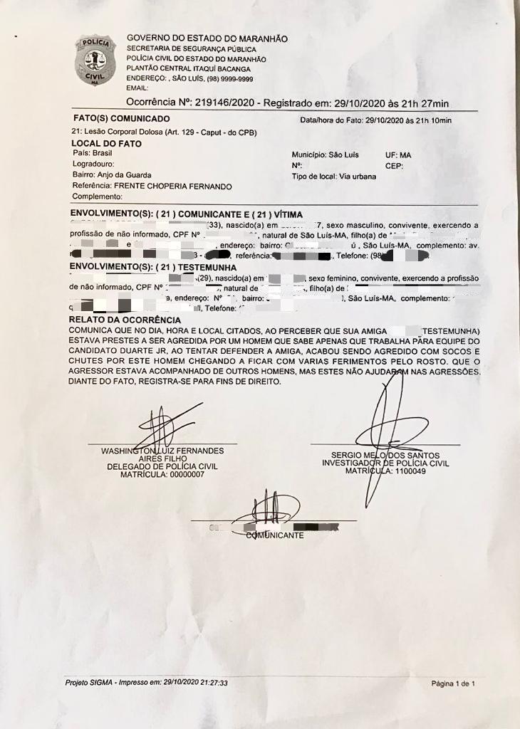 Na noite da última quinta-feira (29), um assessor do deputado estadual Wellington do Curso foi covardemente agredido por um funcionário do candidato a prefeito Duarte Jr. O fato aconteceu em via pública, quando o assessor do deputado Wellington efetuava filmangens de um incêndio que ocorreu nas proximidades do portão da Vale, no Anjo da Guarda, causado por foguetes lançados durante evento de Duarte Jr. O rapaz que se intitulou segurança do candidato Duarte, desferiu um soco no rosto do assessor do deputado Wellington, que ao cair ainda foi agredido com chute no rosto, objetivando interromper as filmagens. O assessor deverá passar por uma cirurgia a fim de corrigir a fratura do osso nasal.