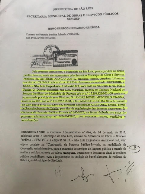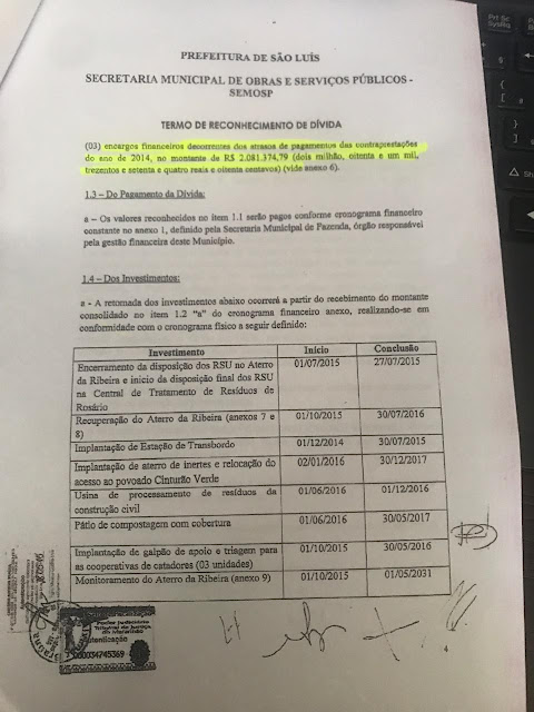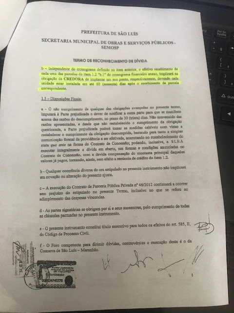 Já o ponto 03 do item 1.2, fala sobre a renúncia pela SLEA, dos encargos financeiros decorrentes dos atrasos de pagamento das contraprestações do ano de 2014, no montante de R$ 2.081.374,79, ou seja, foram incluídos no bojo da negociação, períodos já durante a gestão do prefeito Edvaldo Holanda Junior e que também não foram pagos, informação essa omitida dos vereadores.