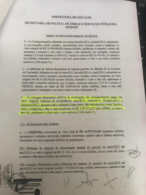 No site a verdade é bem diferente do que foi apresentado no PL. Pela letra d do item 1.1 do Termo de Reconhecimento de Dívida, verifica-se que os encargos financeiros relativos às atualizações das contraprestações pagas no valor original) relativos as competências maio/2012, junho/2012, fevereiro/2013 a dezembro/2013, apurados até a assinatura deste termo são reconhecimentos como líquidos, certos e exigíveis, e têm o valor atualizado de R$ 3.097.512,07(três milhões, noventa e sete mil, quinhentos e doze reais e sete centavos.