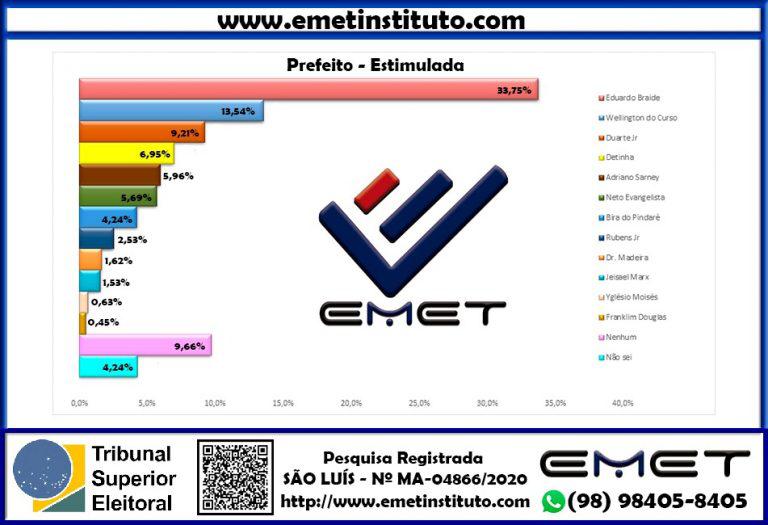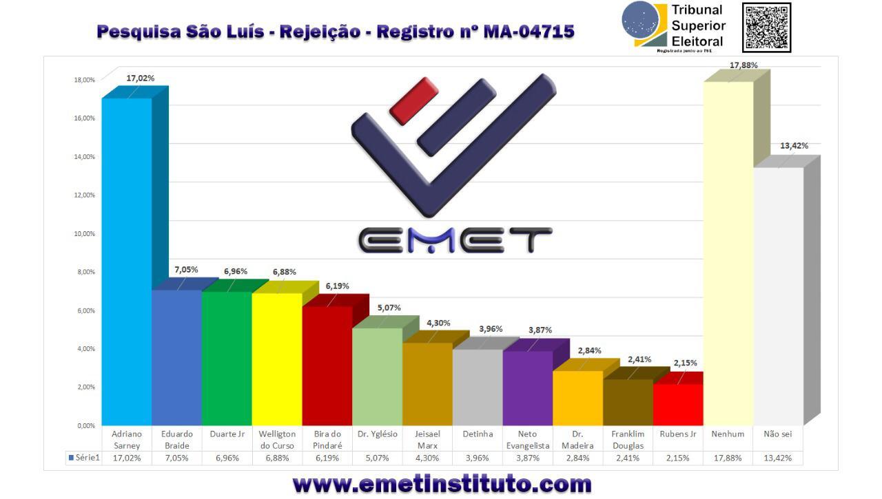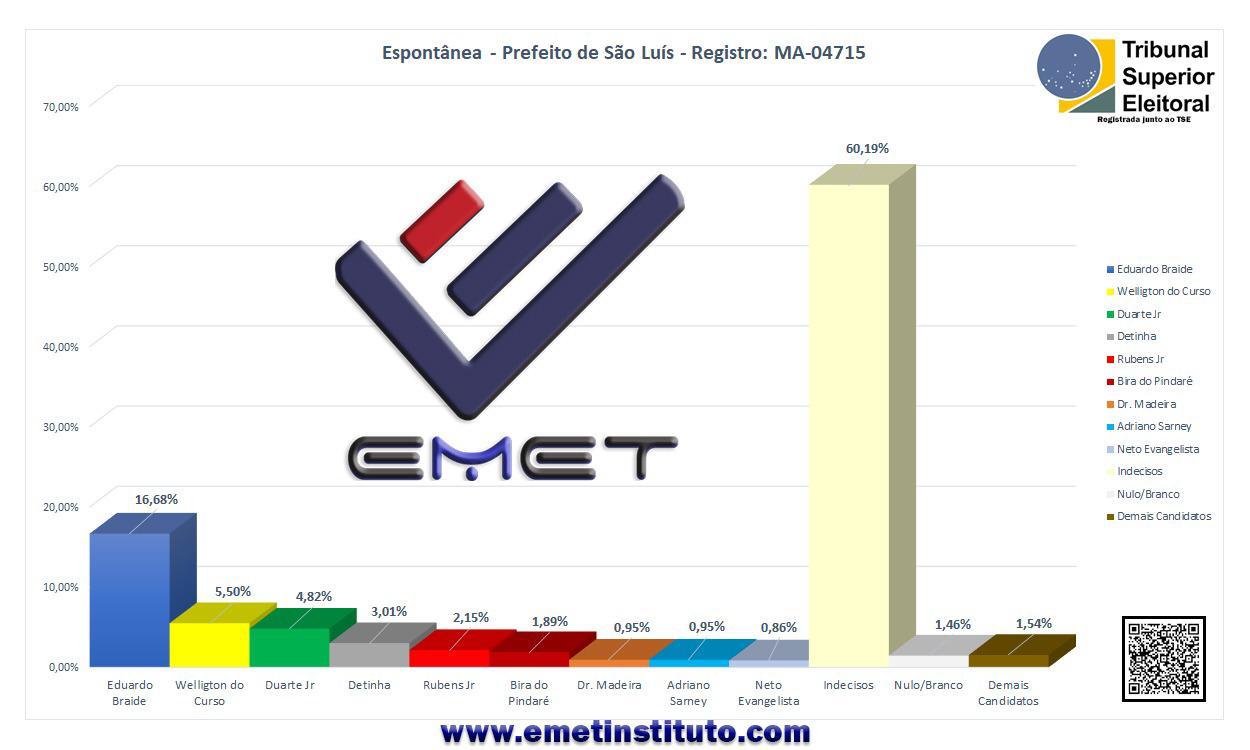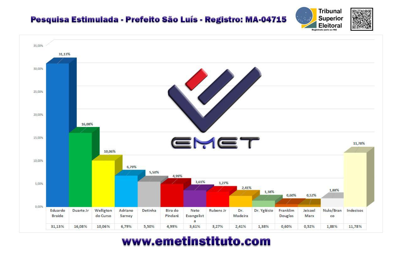 A pesquisa do EMET Instituto entrevistou 1.065 pessoas, foi realizada entre os dias 26 a 30 de Agosto e está registrada junto ao TSE sob o nº MA-04715.