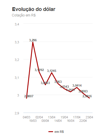 No mês de abril, o dólar acumula queda de 6,56%. No ano, entretanto, a valorização ainda é de 12,15%.