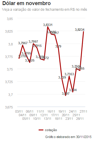 A moeda norte-americana subiu 1,65%, a R$ 3,8865 na venda, após subir mais de 2% e atingir R$ 3,9237 na máxima da sessão, maior nível intradia desde 29 de outubro, quando foi a R$ 3,9574. Na mínima do dia, a moeda foi a R$ 3,8247. Veja a cotação do dólar hoje. Em novembro, o dólar subiu 0,61%. No ano, há alta acumulada de 46,18%.