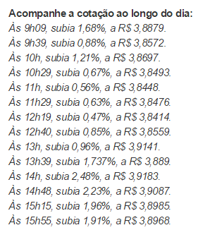 O dólar operou em alta durante toda a sessão, mas chegou a apresentar avanços bem menores na parte da manhã, batendo na mínima de R$ 3,8347 do dia. Operadores atribuíram a volatilidade matutina à briga pela formação da Ptax de novembro, taxa calculada pelo BC que serve de referência para diversos contratos cambiais.Intervenção do BC