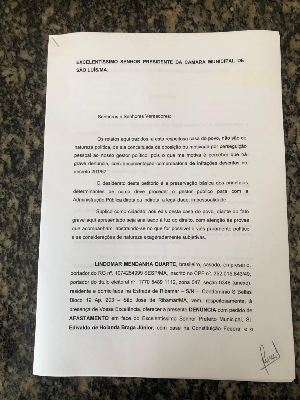 Um novo pedido de impeachment contra o prefeito de São Luís, Edivaldo Júnior (PDT), foi protocolado na manhã desta quarta-feira (16) na Câmara Municipal de Vereadores. O documento é assinado pelo empresário Lindomar Medalha Duarte.