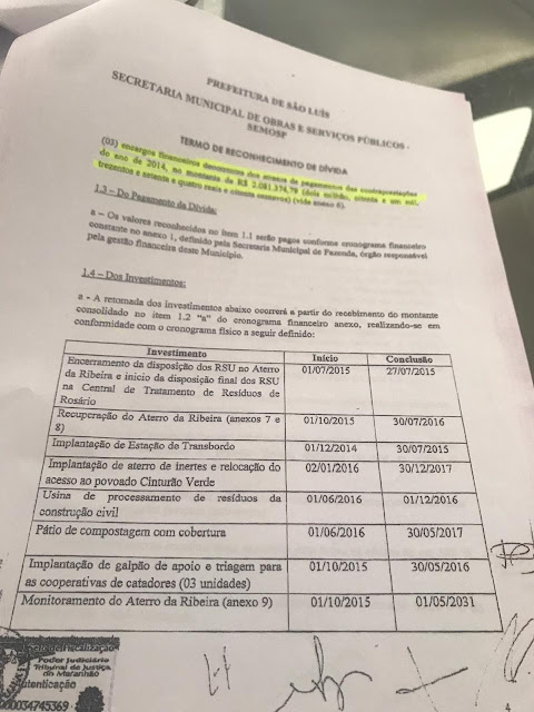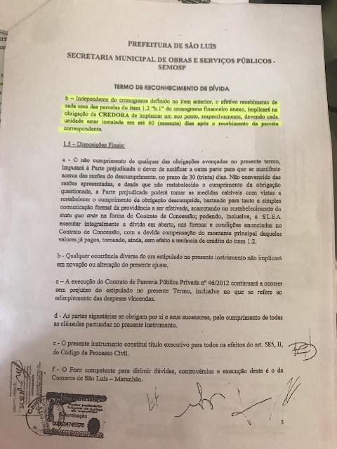 Além disso, a construção dos equipamentos também foi previsto no polêmico Termo de Reconhecimento de Dívida (TRD). A letra “b” do item 1.4, que versa sobre os investimentos que deverá ser feitos pela credora, no caso, a SLEA, adus: “independente do cronograma definido no item anterior, o efetivo recebimento de cada uma das parcelas do item 1.2 “b.1” do cronograma financeiro anexo, implicará na obrigação da CREDORA de implantar um eco ponto, respectivamente, devendo cada unidade estar instalada em até 60(sessenta) dias após o recebimento da parcela correspondente”.