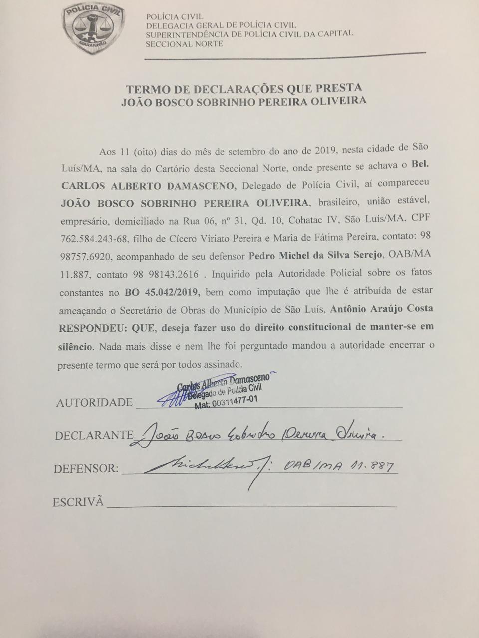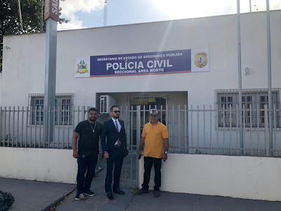 Neste momento, acompanhados pelo advogado Pedro Michel Serejo, os empreiteiros João Bosco e Lindonar Duarte, representantes da empresa Yara Transportadora- prestam depoimento ao delegado Carlos Alberto Damasceno, na Seccional da Área Norte da Polícia Civil, no Habitacional Turu.