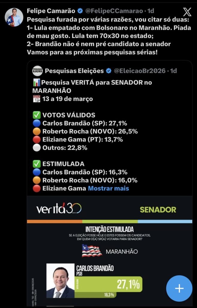 O vice-governador do Maranhão, Felipe Camarão, criticou publicamente os resultados de uma pesquisa eleitoral divulgada recentemente pelo instituto Veritá, que projeta cenários para a disputa de 2026 no estado. Em manifestação feita nas redes sociais, o gestor classificou o levantamento como inconsistente e questionou a credibilidade dos dados apresentados.