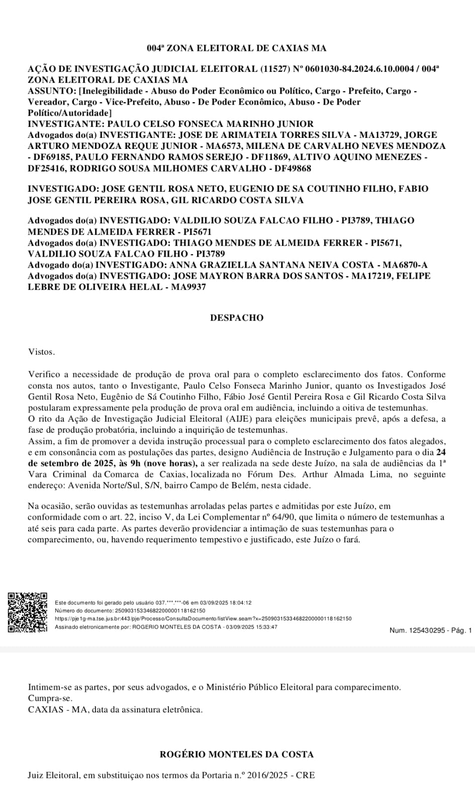 CAXIAS (MA) – O juiz eleitoral Rogério Monteles da Costa, da 004ª Zona Eleitoral de Caxias, determinou a realização de audiência de instrução e julgamento em um processo que apura suposto abuso de poder econômico e político durante as eleições municipais.