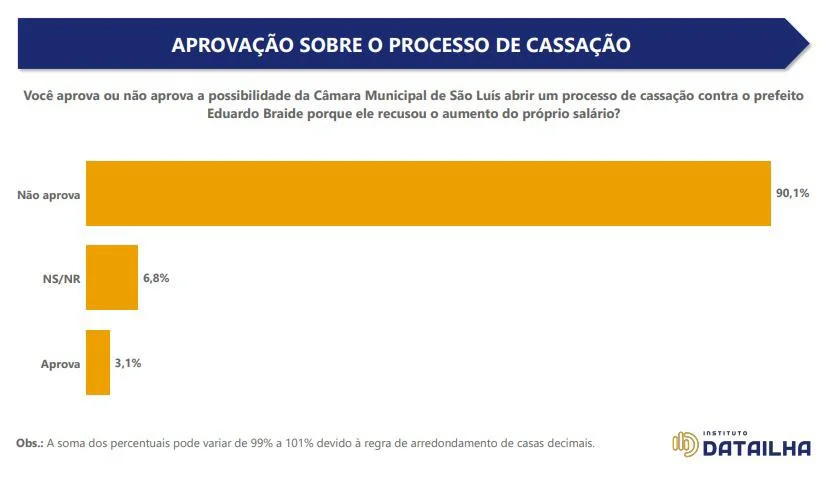 Uma pesquisa divulgada nas redes sociais nesta segunda-feira (8) reacendeu o debate sobre o processo de impeachment do prefeito de São Luís, Eduardo Braide (PSD). O levantamento afirma que 90,1% dos entrevistados seriam contrários à abertura do processo de cassação, mas a metodologia e a forma como os dados foram apresentados levantaram questionamentos entre especialistas e lideranças políticas.