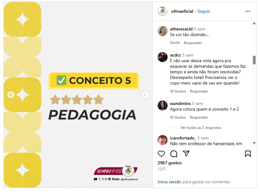 A nota 5 em Pedagogia foi imediatamente publicada com alarde nas redes da UFMA como “prova do avanço da gestão de Fernando Carvalho”. Mas basta caminhar pelos corredores do Centro de Ciências Sociais (CCSO), onde funciona o curso, para perceber que o discurso não encontra respaldo na realidade.