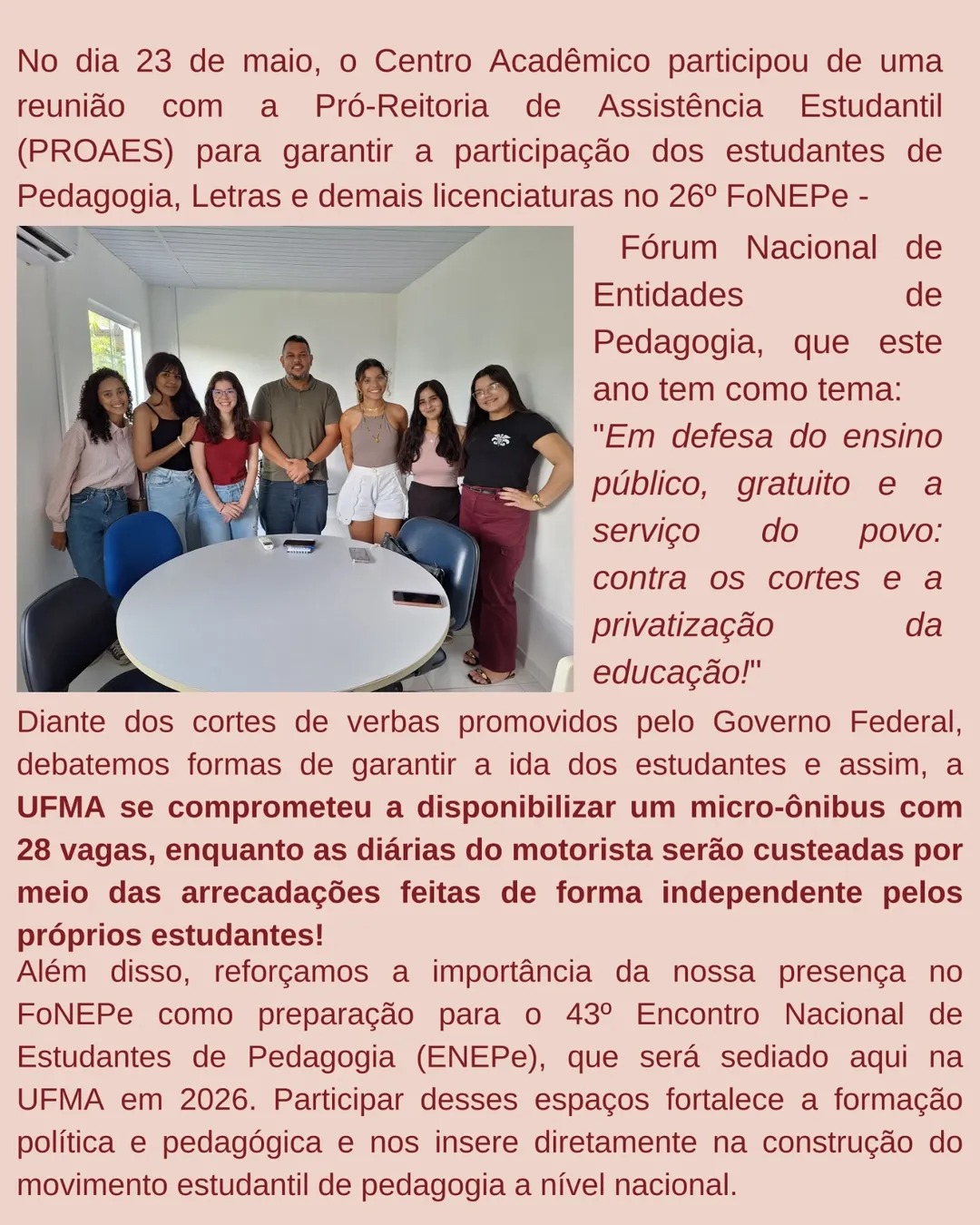 A resposta da PROAES? Um micro-ônibus de 28 lugares para levar representantes dos cursos de Pedagogia, Letras e outras licenciaturas. E pasmem: nem mesmo as diárias do motorista foram cobertas pela UFMA. Os estudantes, já precarizados, tiveram que correr atrás de recursos por conta própria.
