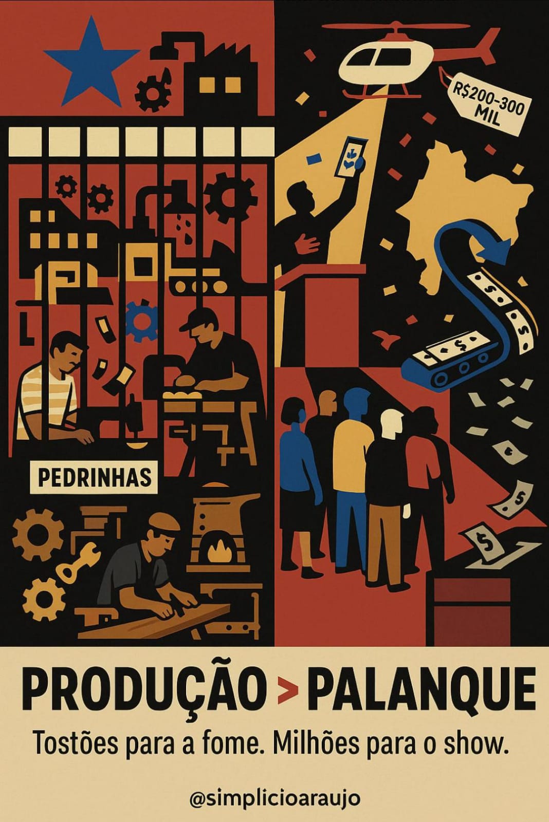 Enquanto isso, o circo custa caro. Palco, segurança, deslocamentos, aeronaves, aparato de comunicação — cada evento pode queimar centenas de milhares de reais em estrutura, microfones e holofotes. O show fica; o emprego não. Cada entrega de cartões leva em média 80 mil para a população pobre e custa entre 300 e 500 mil reais aos cofres públicos.