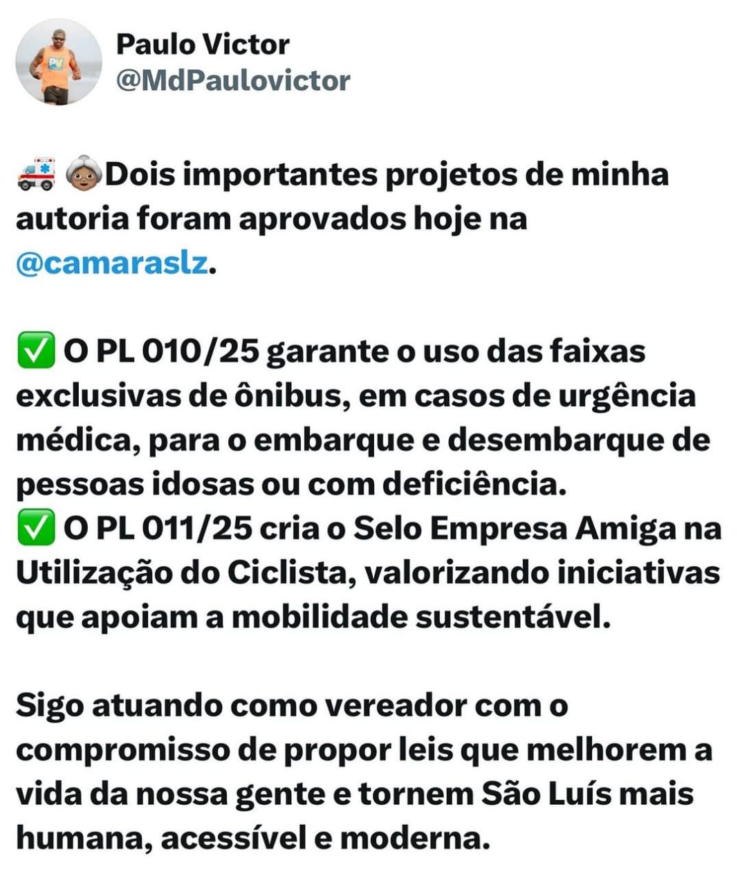 Paulo Victor destacou que os projetos seguem seu compromisso como parlamentar de propor leis que tragam benefícios reais para a população de São Luís. “Seguimos trabalhando para construir uma cidade mais humana, acessível e moderna. Nosso objetivo é melhorar a qualidade de vida da nossa gente, olhando sempre para a inclusão e a sustentabilidade”, afirmou o vereador.