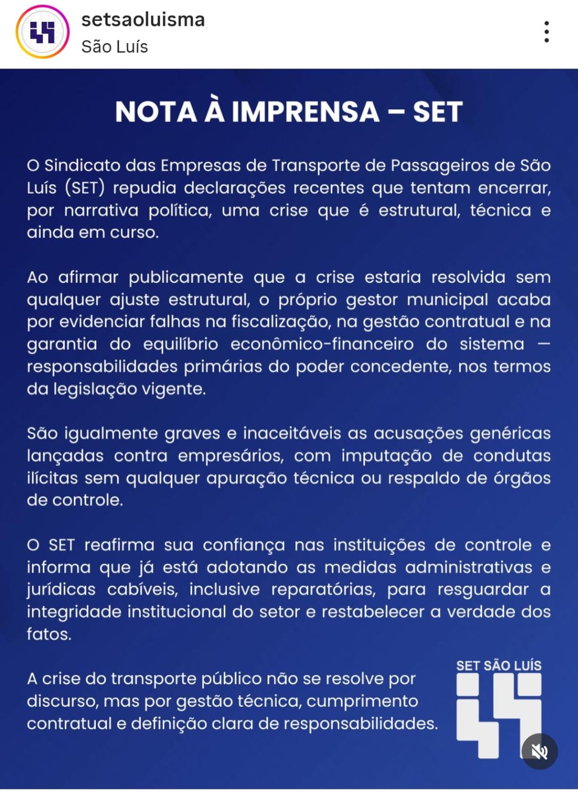 O Sindicato das Empresas de Transporte de Passageiros de São Luís (SET) divulgou nota pública rebatendo declarações recentes sobre a crise do transporte coletivo na capital maranhense. Segundo a entidade, a situação não pode ser tratada como resolvida por meio de discursos políticos, pois envolve problemas estruturais e técnicos que ainda persistem no sistema.