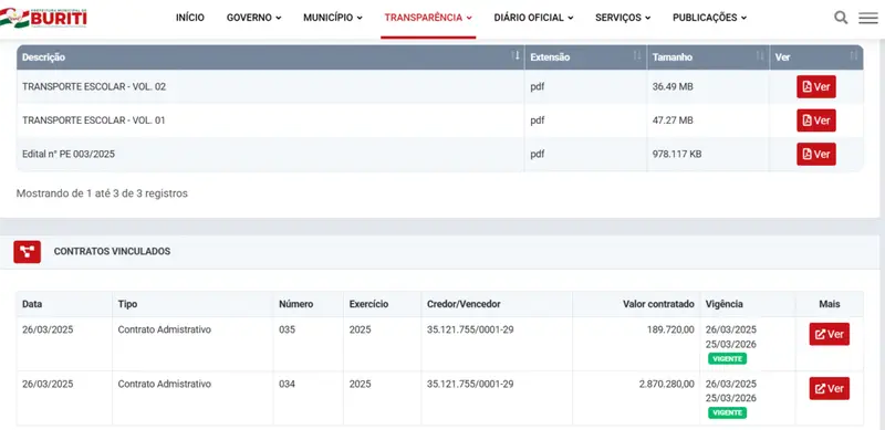 Apesar das denúncias, a Prefeitura de Buriti firmou dois contratos administrativos com a empresa J.A.S. Empreendimentos (CNPJ 35.121.755/0001-29) para prestação do serviço de transporte escolar no valor de R$ 3.060.000,00 (três milhões e sessenta mil reais).